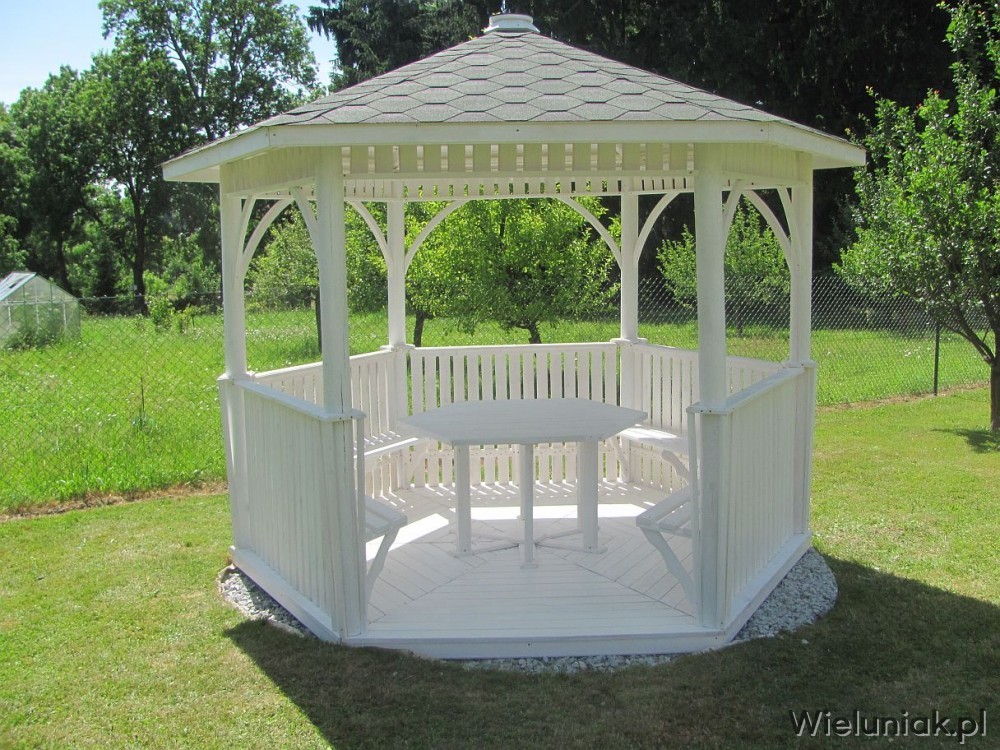 Altany ogrodowe wykonywane są z drewna sosnowego. Każda altana drewniana jest ustawiana na odpowiednio rozmieszczonych i wypoziomowanych podkładach betonowych, które zabezpieczają przed gromadzeniem się wody pod podłogą altany i zapewniają cyrkulację powietrza pod podłogą. Stosujemy również agrowłókninę, której zadaniem jest zapobieganie przerastaniu roślinności między deskami podłogowymi. Słupy altany mają wysokość 200 cm, natomiast całkowita wysokość altany wynosi 270 cm. Dachy altan wykonane są z desek boazeryjnych oraz pokryte gontem bitumicznym co zapewnia długoletnią trwałość każdej altany oraz odpowiednie wrażenia estetyczne. Każda z altan wyposażona jest w zestaw mebli, na który składają się stół z sześciokątnym blatem oraz 5 ławek, zamocowanych do altany. Wszystkie elementy altany są odpowiednio strugane oraz dwukrotnie impregnowane. Na życzenie klienta możemy zamontować w altanie oświetlenie oraz dodatkowe kratownice. Wszystkie altany montujemy samodzielnie. Dostarczamy nasze produkty na terenie Polski oraz zagranicę. Koszty transportu uzgadniamy indywidualnie z każdym klientem.