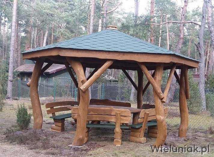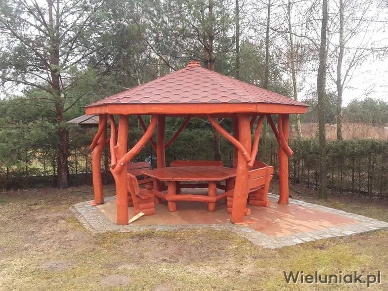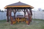 - stół sześciokątny (blat z bala drewna liściastego o gr. 4cm) przystosowany do rozmiaru altany oraz