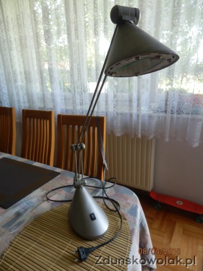 Lampa na biurko z ruchomym wysięgnikiem i mozliwościa kierowania strumieniem światła o dwóch natężeniach. Doskonała przy oświetleniu miejsca pracy, czytania w łóżku. odrabiania lekcji i kreślenia rysunków. Jest masywna, w pełni sprawna i bezpieczna. Lampa jest czarnego koloru / zdjęcie prezentuje identyczną ale popielatą. Zapraszam do zakupu najlepiej z odbiorem osobistym z uwagi na jej wagę -ale mogę też przesłać.