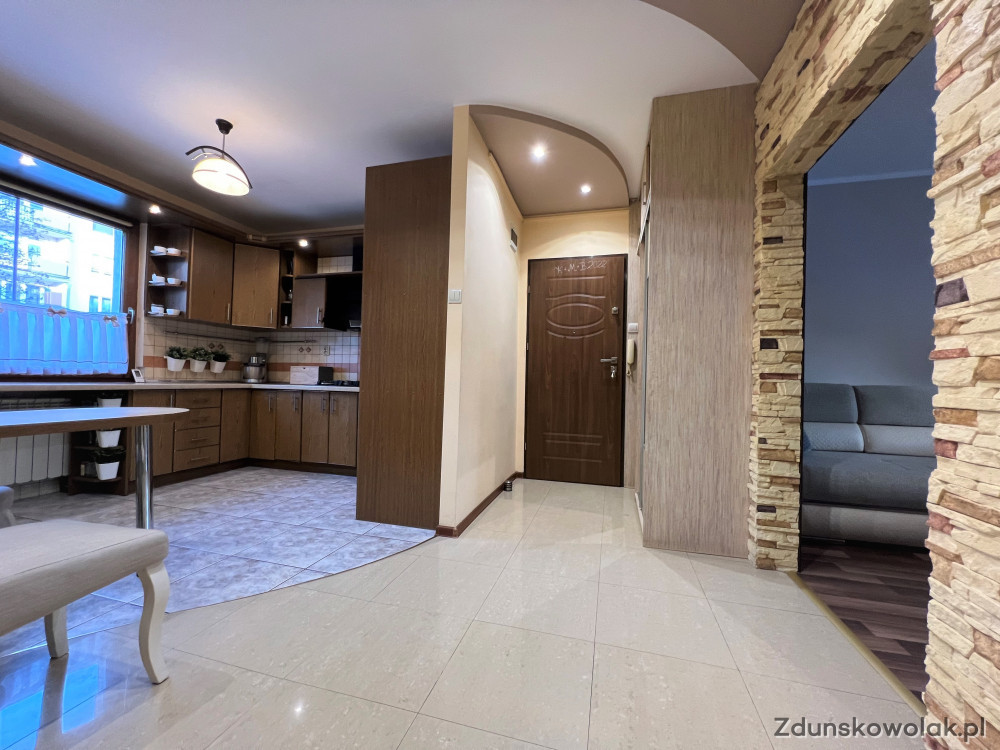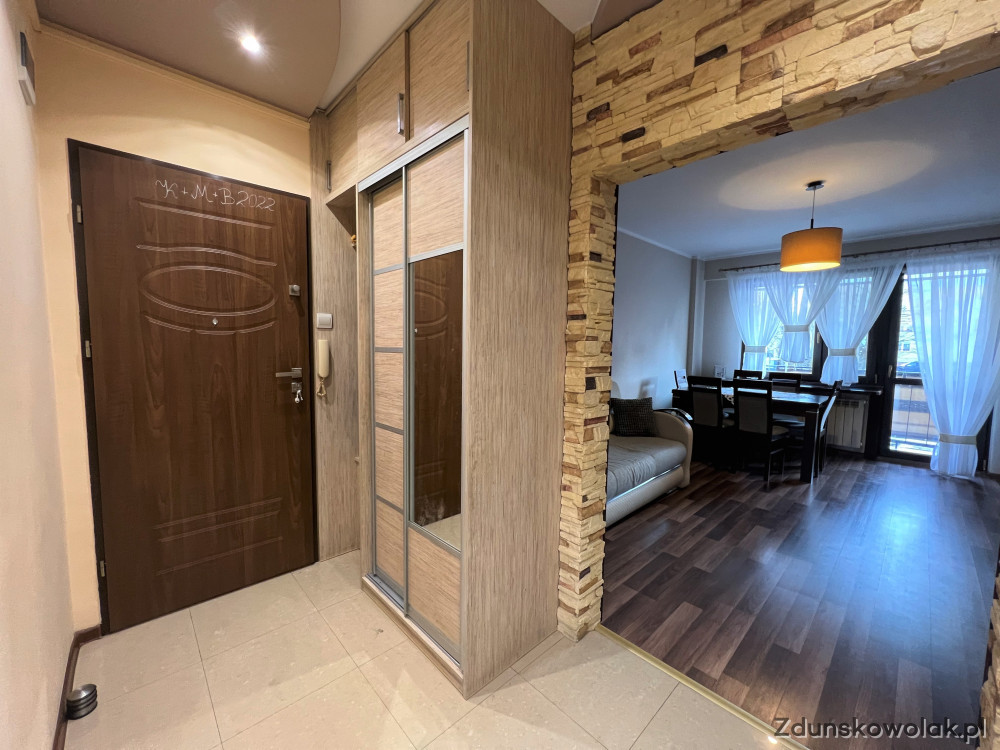 Poprzez częściowe wyburzenie ściany pomiędzy korytarzem a kuchnią, mieszkanie wita nas dużą przestrzenią. Przy wejściu zabudowa stała szaf. W tej części ozdobne elementy sufitów podwieszanych z oświetleniem punktowym.