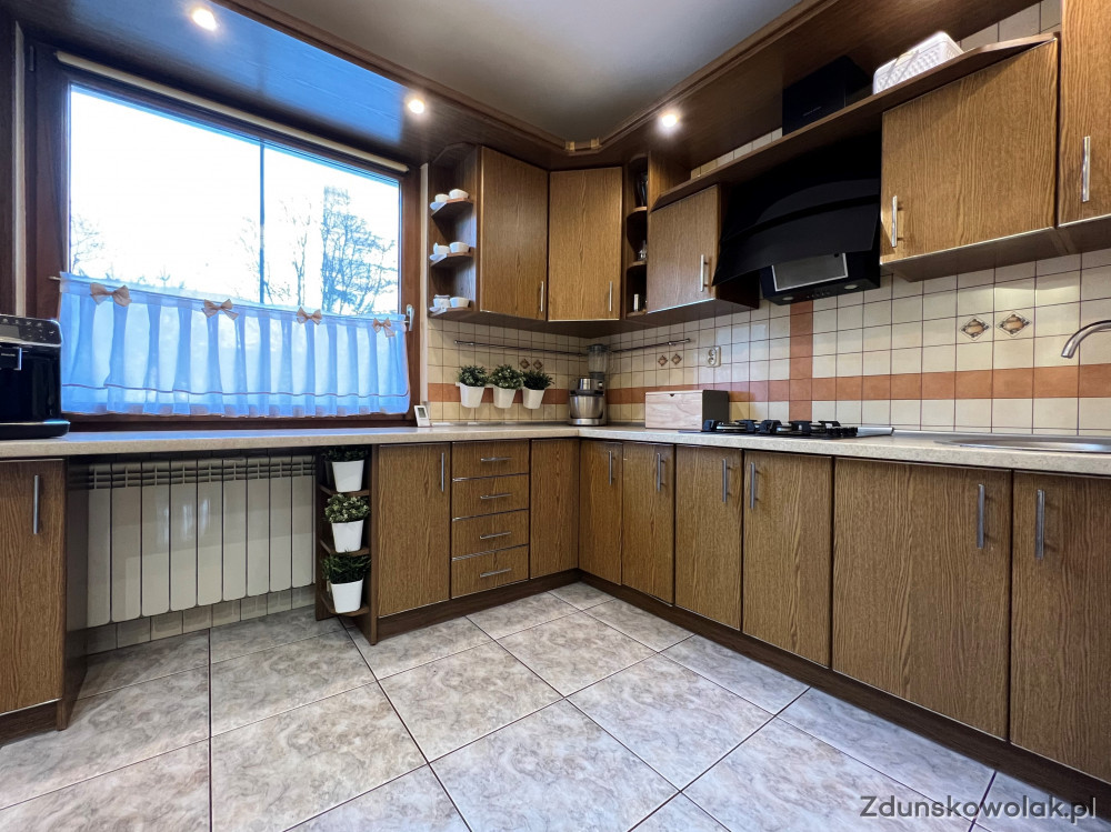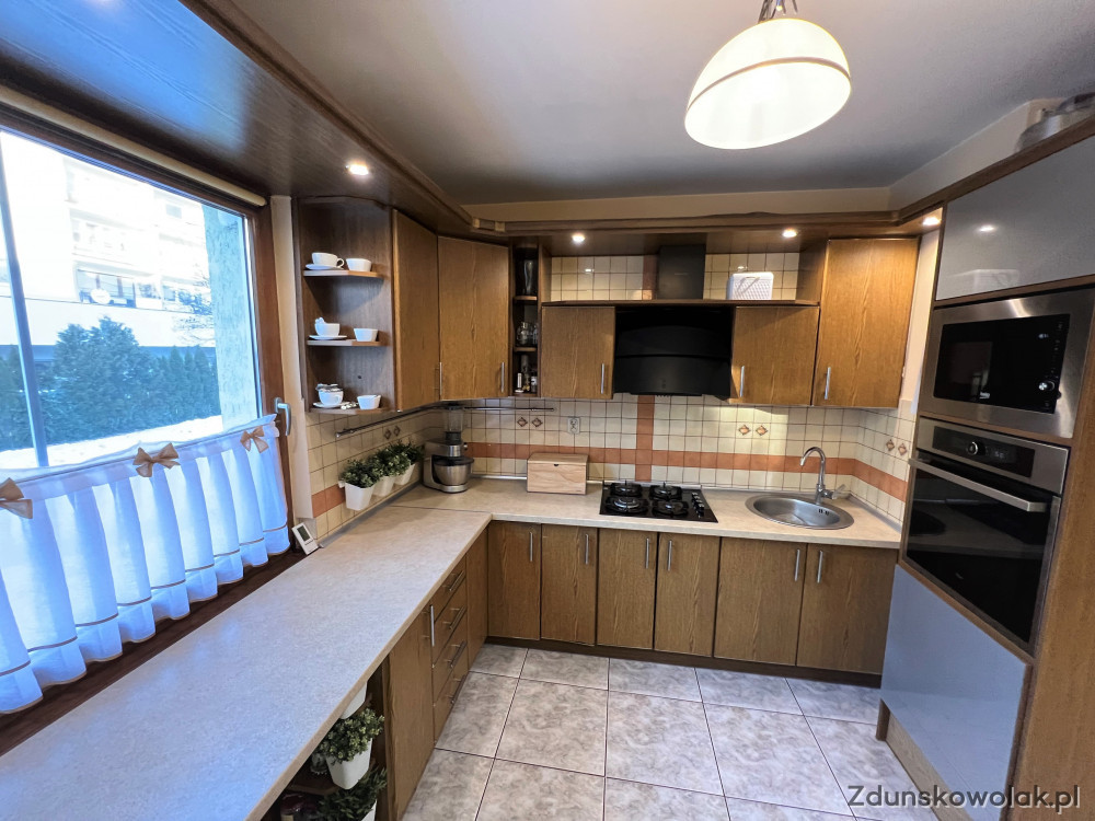 Niewątpliwym atutem tego układu pomieszczeń jest duża, zbliżona do kwadratu kuchnia o pow. 10,54 m.kw. na wyposażeniu której pozostają widoczne na zdjęciach meble w zabudowie. Podłoga wyłożona jasną terakotą.