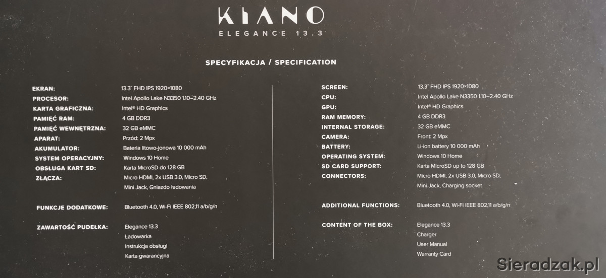 Sprzedam netbook Kiano Elegance 13.3 z wyświetlaczem (przekątna)13,3 cali., oryginalny Windows 10 Home.