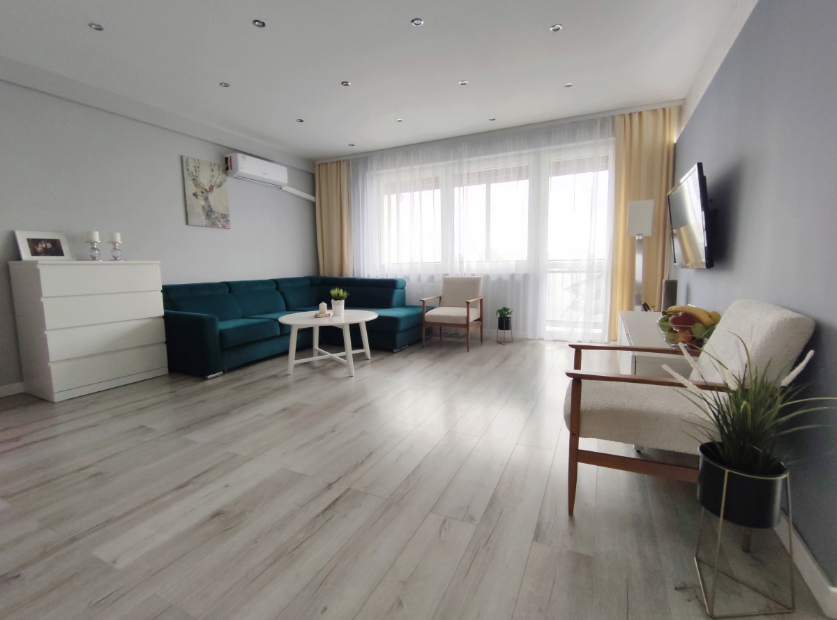 Salon - bardzo przestrzenny, dobrze doświetlony, z wyjściem na balkon typu loggia, klimatyzacja, na podłodze panele, roleta zewnętrzna