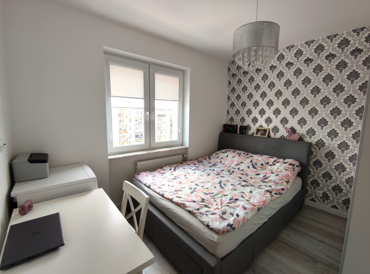 Pokój 1 - ściany w kolorze białym, na jednej położona tapeta, szafa pod wymiar, rolety wewnętrzne na oknach, na podłodze panele