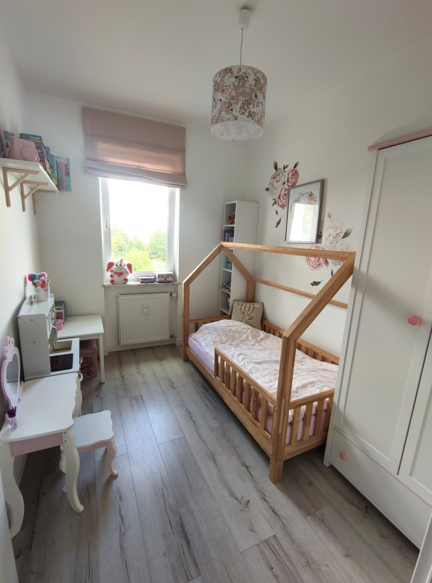 Pokój 2 - ściany w kolorze białym, roleta wewnętrzna, na podłodze panele