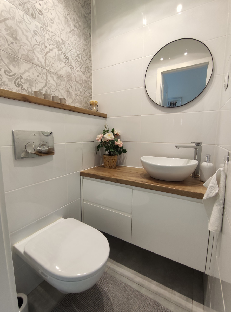 Toaleta - WC z zestawem podtynkowym, zabudowa wykonana pod wymiar, umywalka nablatowa, lustro, na podłodze gres