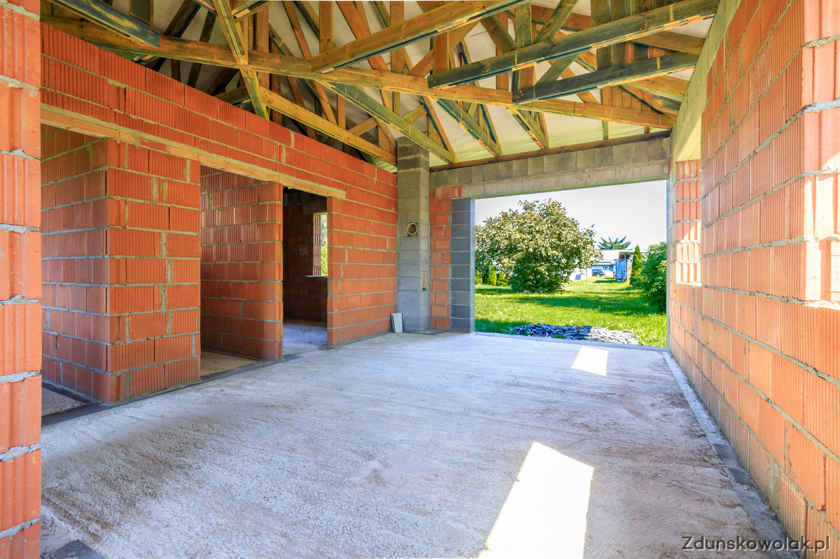 Doprowadzona została instalacja elektryczna oraz wodna, a także podłączona kanalizacja miejska. Fundamenty domu zostały starannie wykonane na głębokości -1,25 m, z żelbetonową ławą zbrojoną stalowymi prętami. Ściany fundamentowe mają grubość 25 cm i są zabezpieczone poziomą izolacją przeciwwilgociową. Ściany zewnętrzne domu to konstrukcja dwuwarstwowa o grubości 40 cm, z pustaka szczelinowego MAX oraz izolacji z 15 cm styropianu i wełny mineralnej. W budynku zastosowano również wentylację grawitacyjną. Dach jest kompletny z systemem orynnowania, a dom został zaprojektowany z myślą o przyszłym ogrzewaniu pompą ciepła oraz instalacji paneli fotowoltaicznych.