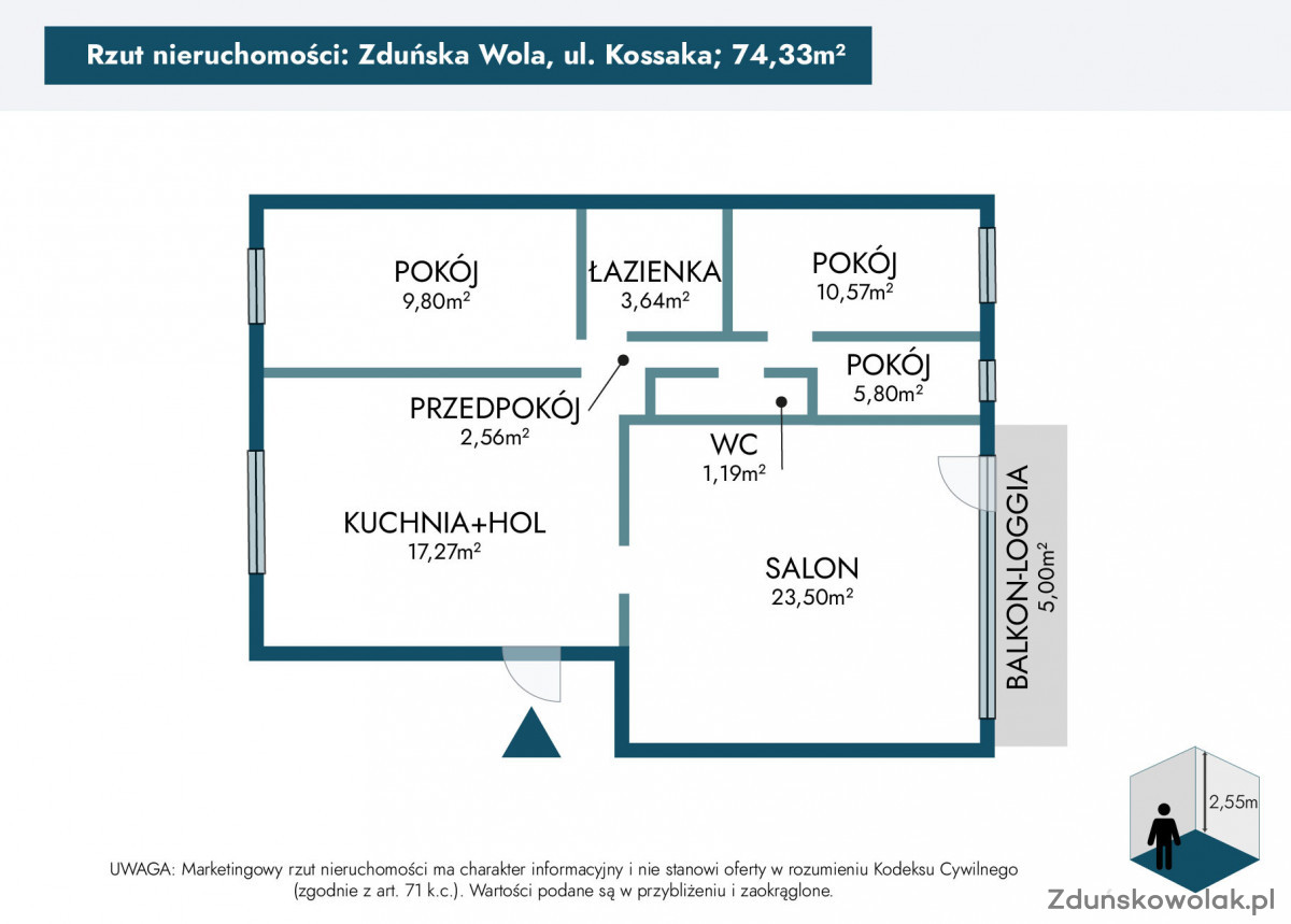 Na sprzedaż przestronne i nowoczesne mieszkanie o powierzchni 74,33 m², usytuowane na trzecim piętrze w czteropiętrowym bloku. Nieruchomość znajduje się w jednej z najlepszych lokalizacji w Zduńskiej Woli - na osiedlu Południe przy ul. Kossaka, w otoczeniu zieleni, z doskonałym dostępem do infrastruktury miejskiej.