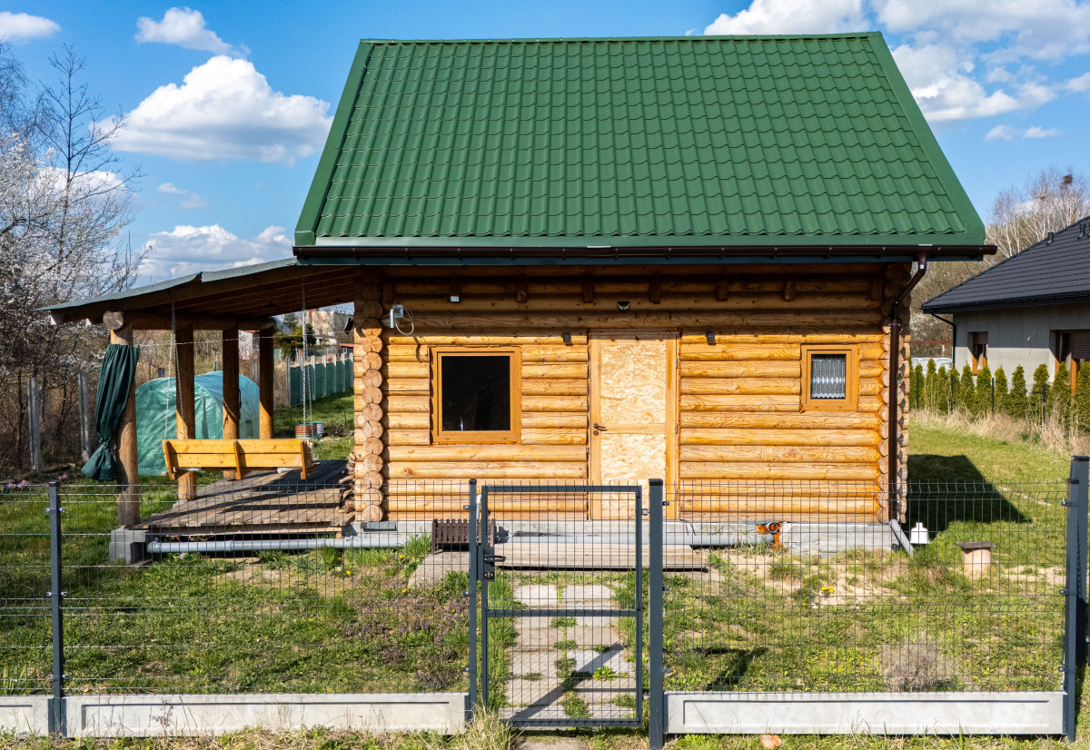 Dom z bala świerkowego ma powierzchnię zabudowy 33,64 mkw. Dach wykonany z blachy.