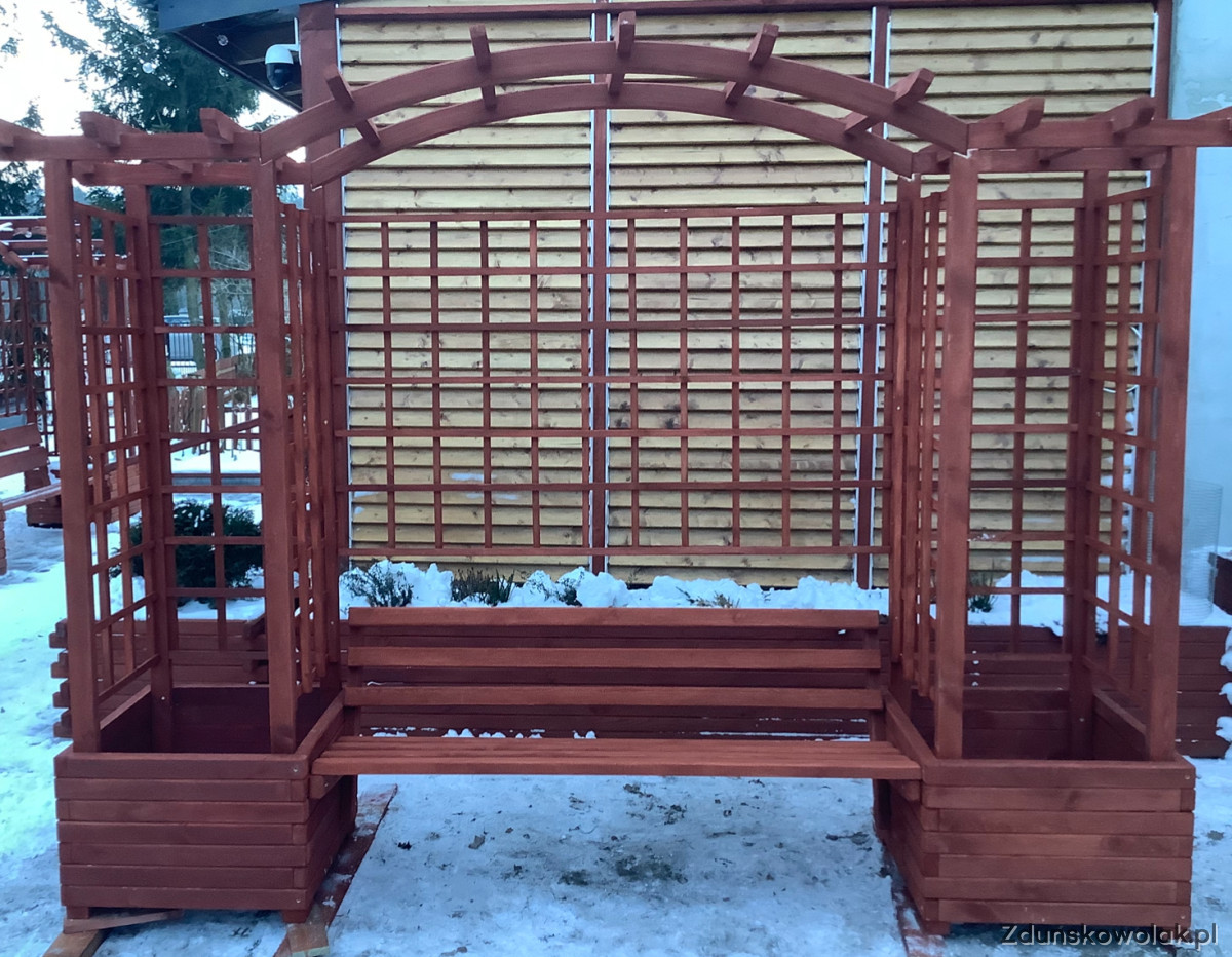 Nie jest to produkt marketowy, tylko solidna konstrukcja zaprojektowana jako miejsce do siedzenia, cienia i odpoczynku. Kratki pod pnącza dają prywatność, a ławka tworzy gotową strefę relaksu.