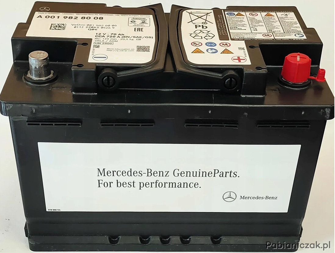Akumulator A0019828008 (kod producenta) to oryginalna bateria rozruchowa przeznaczona do samochodów marki Mercedes-Benz, wykonana w technologii AGM (Absorbent Glass Mat), stosowana fabrycznie w wielu modelach tej marki.