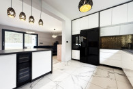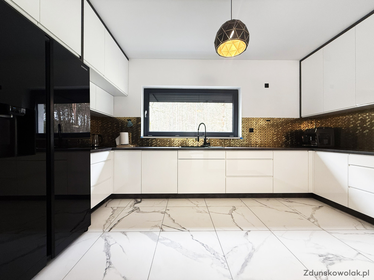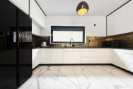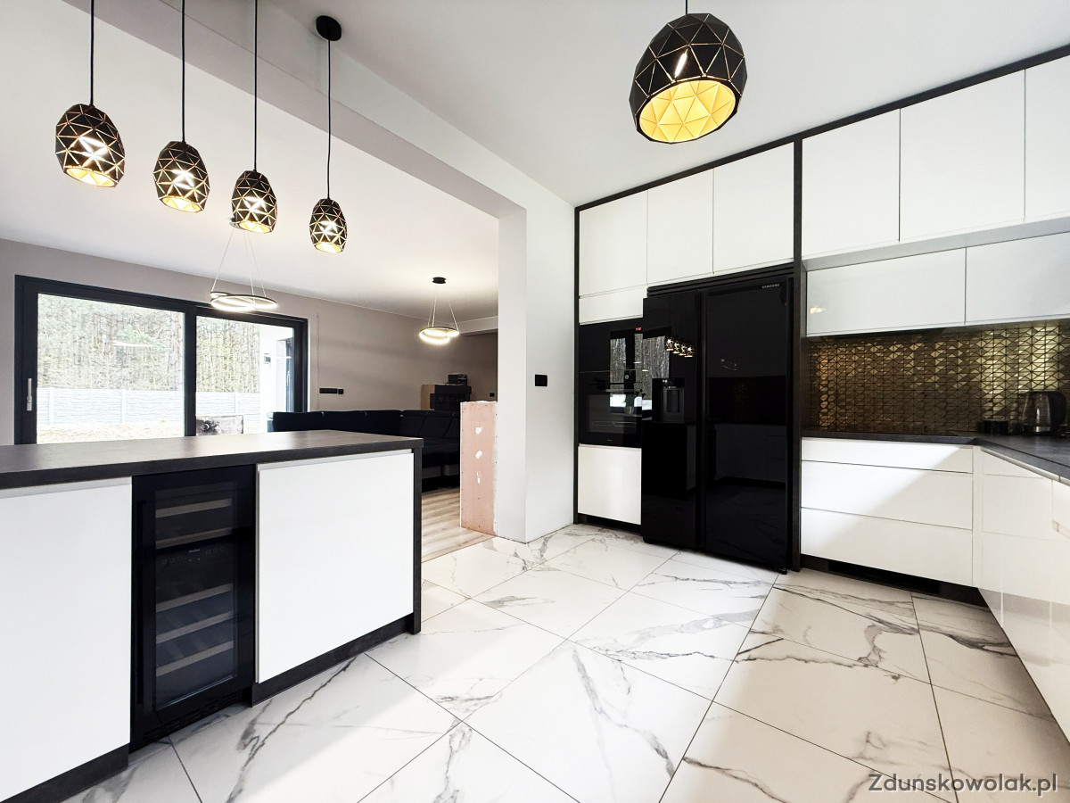 ► Przestronny salon z aneksem kuchennym i częścią jadalnianą. Kuchnia w nowoczesnej zabudowie, wyposażona w płytę indukcyjną, piekarnik w zabudowie, winiarkę oraz lodówko-zamrażarkę,