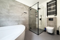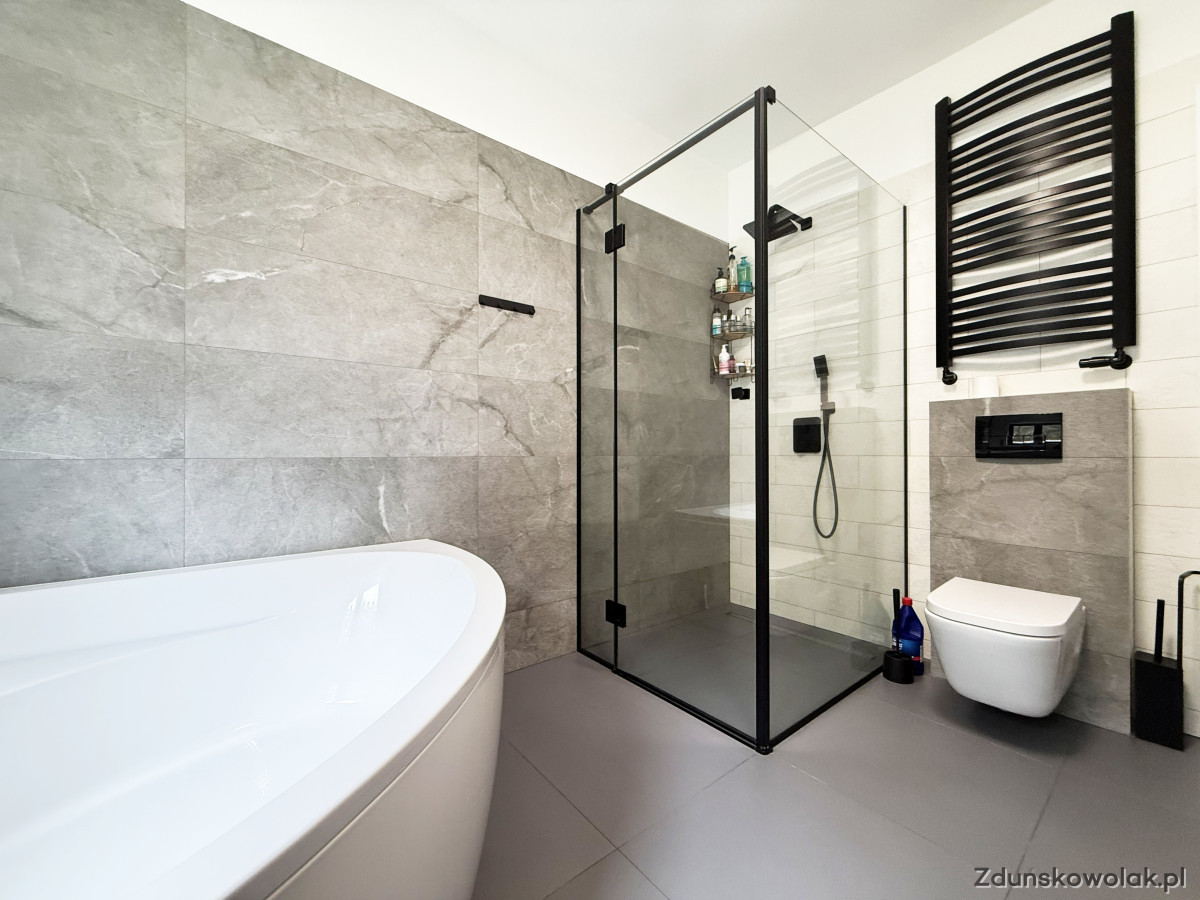 ► Łazienka z WC wyposażona w wannę narożną i kabinę prysznicową,